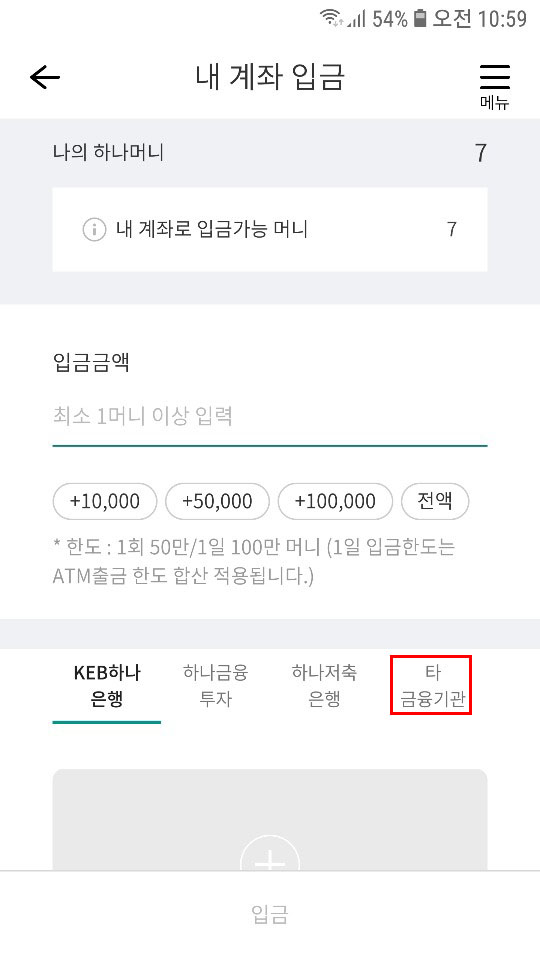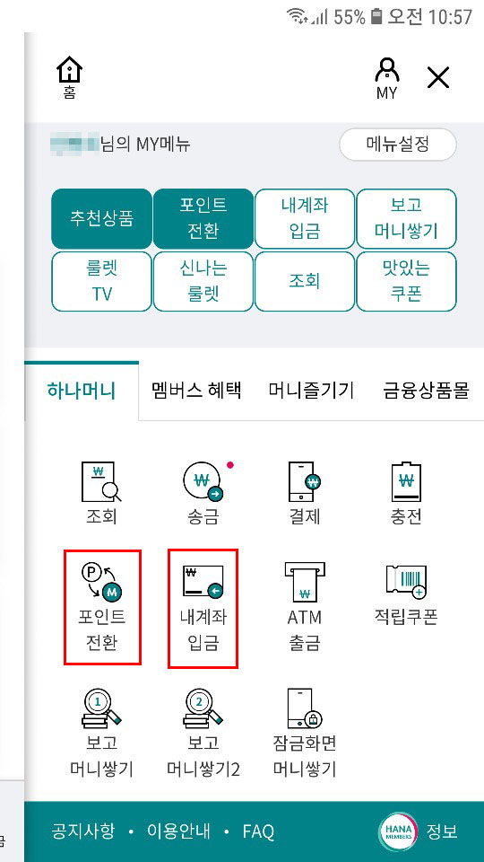 하나머니 - 내 계좌입금 클릭 ( 여기서 포인트 전환에서 오케이캐시백 포인트를 하나 머니로 전환)