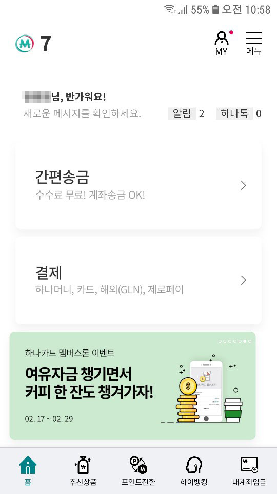 하나 멤버스 앱에 들어가면 오른쪽 맨 위에 메뉴 버튼 클릭