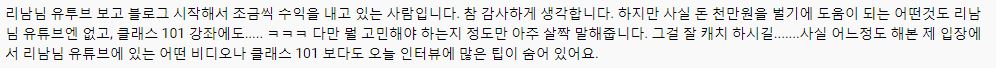 리남님 유투브 보고 블로그 시작해서 조금씩 수익을 내고 있는 사람입니다. 참 감사하게 생각합니다. 하지만 사실 돈 천만원을 벌기에 도움이 되는 어떤것도 리남님 유튜브엔 없고, 클래스 101 강좌에도..... ㅋㅋㅋ 다만 뭘 고민해야 하는지 정도만 아주 살짝 말해줍니다. 그걸 잘 캐치 하시길.......사실 어느정도 해본 제 입장에서 리남님 유튜브에 있는 어떤 비디오나 클래스 101 보다도 오늘 인터뷰에 많은 팁이 숨어 있어요.