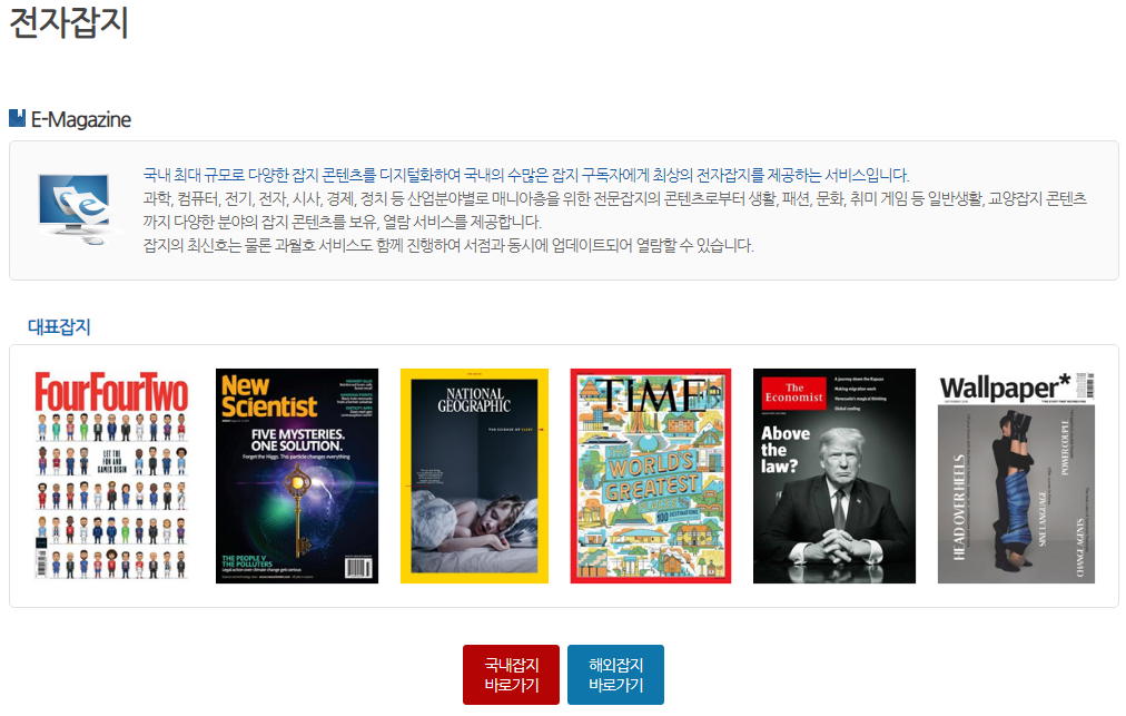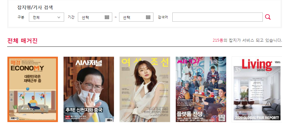 무려 215종의 국내 잡지가 무료로 서비스되고 있습니다.