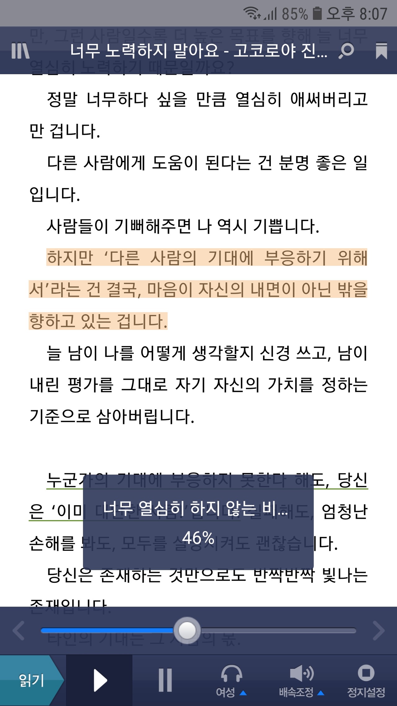 너무 노력하지 말아요는 전자책 앱에서 음성 읽기가 지원되니 방정리하면서도 들을수 있다.