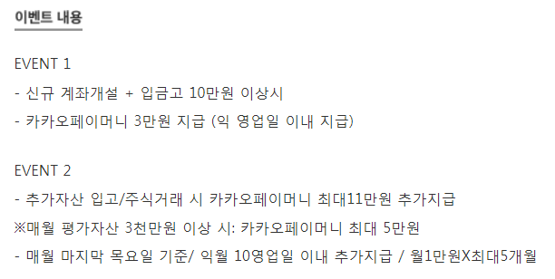 계좌개설&입금고/거래시 3만원~최대 14만원 지급 이벤트 내용 EVENT 1 - 신규 계좌개설 + 입금고 10만원 이상시 - 카카오페이머니 3만원 지급 (익 영업일 이내 지급) EVENT 2 - 추가자산 입고/주식거래 시 카카오페이머니 최대11만원 추가지급 ※매월 평가자산 3천만원 이상 시: 카카오페이머니 최대 5만원 - 매월 마지막 목요일 기준/ 익월 10영업일 이내 추가지급 / 월1만원X최대5개월 ※월 100만원 이상 주식거래 약정 시: 카카오페이머니