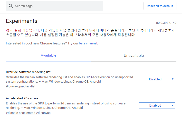 크롬 주소창에 chrome://flags 입력