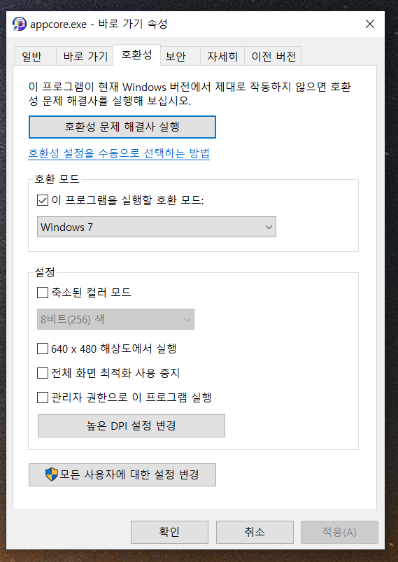호환성 - 호환모드 - Windows 7으로 선택하세요.