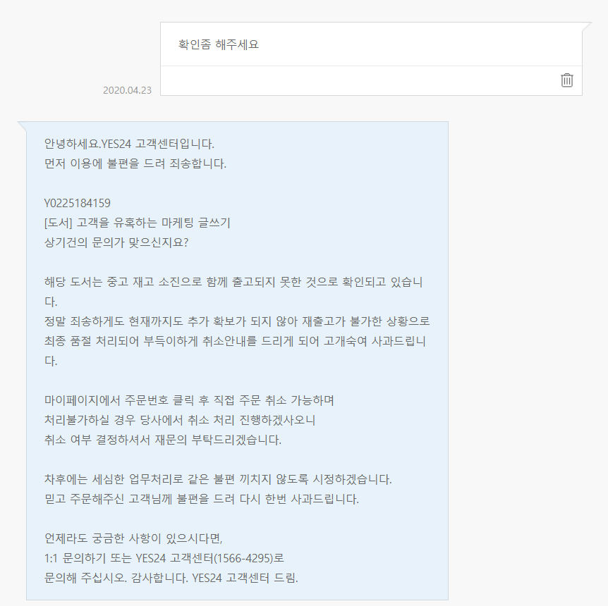 재고가 없으면 빨리 책을 주문한 고객한데 연락을 하는게 먼저 아닌가요?