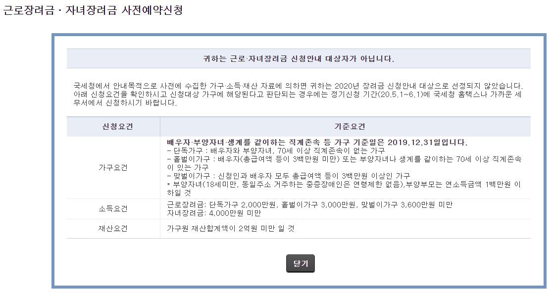 | 소득요건 | 근로장려금: 단독가구 2,000만원, 홑벌이가구 3,000만원, 맞벌이가구 3,600만원 미만 자녀장려금: 4,000만원 미만 |
