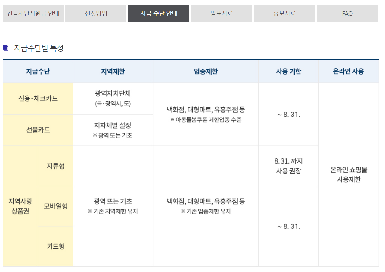 긴급재난지원금 신청방법안내, 지급 수단 안내등을 참고하시기 바랍니다.