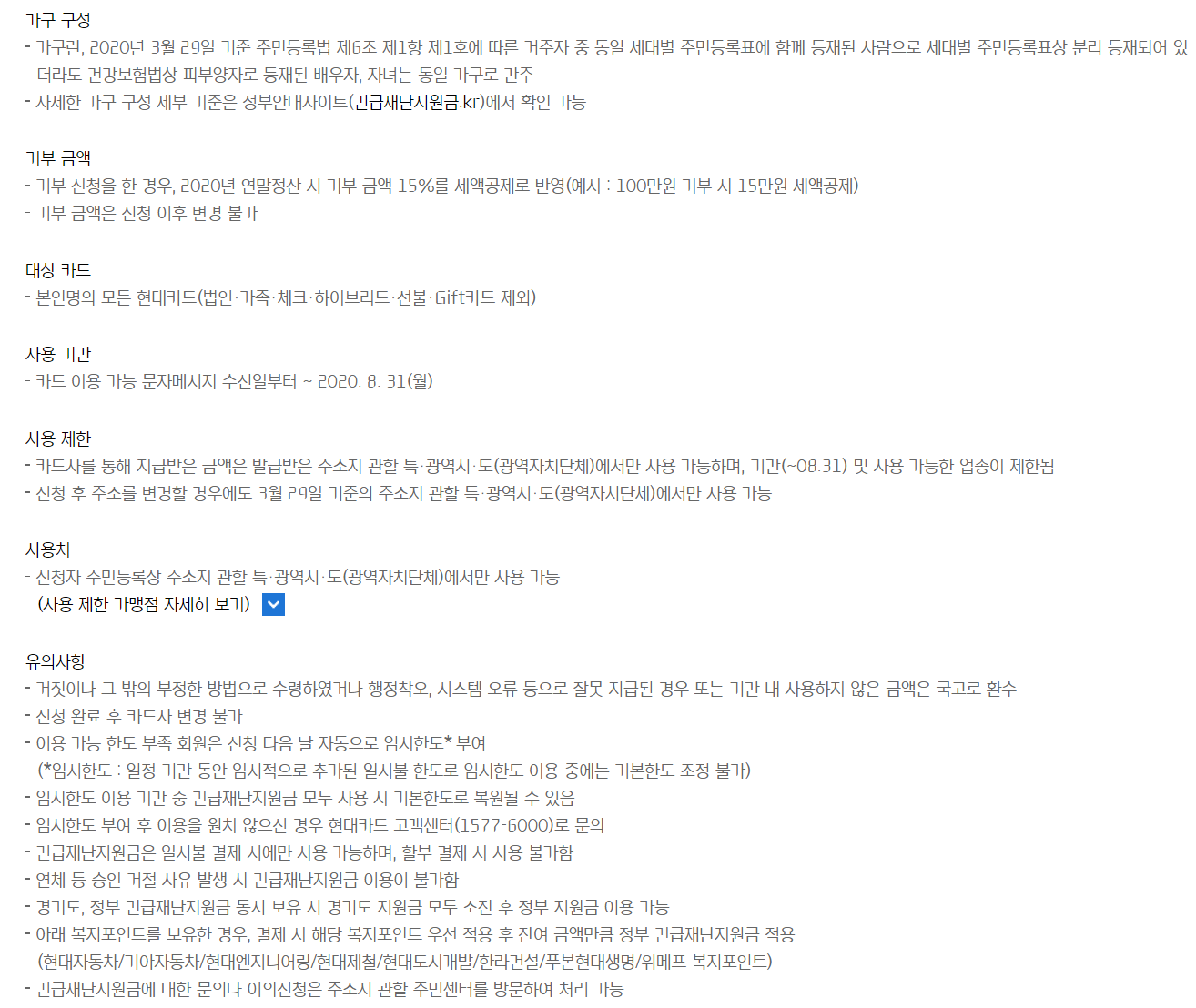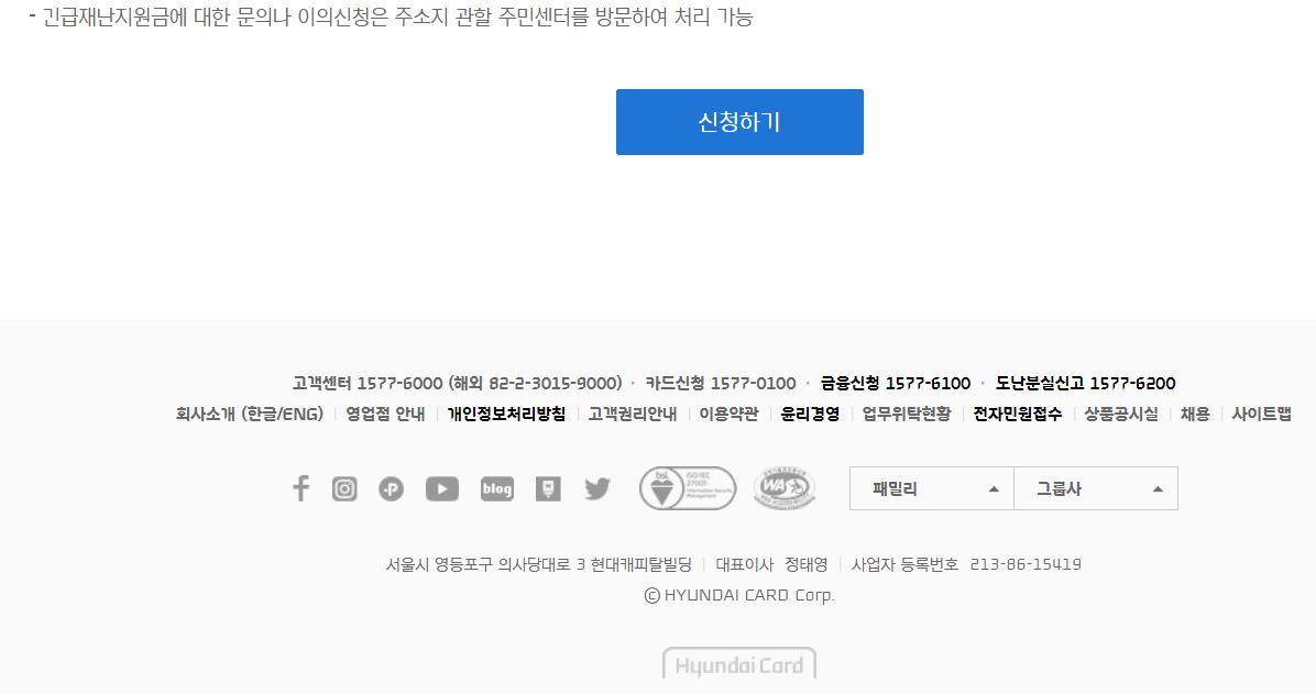 (현대자동차/기아자동차/현대엔지니어링/현대제철/현대도시개발/한라건설/푸본현대생명/위메프 복지포인트) - 긴급재난지원금에 대한 문의나 이의신청은 주소지 관할 주민센터를 방문하여 처리 가능