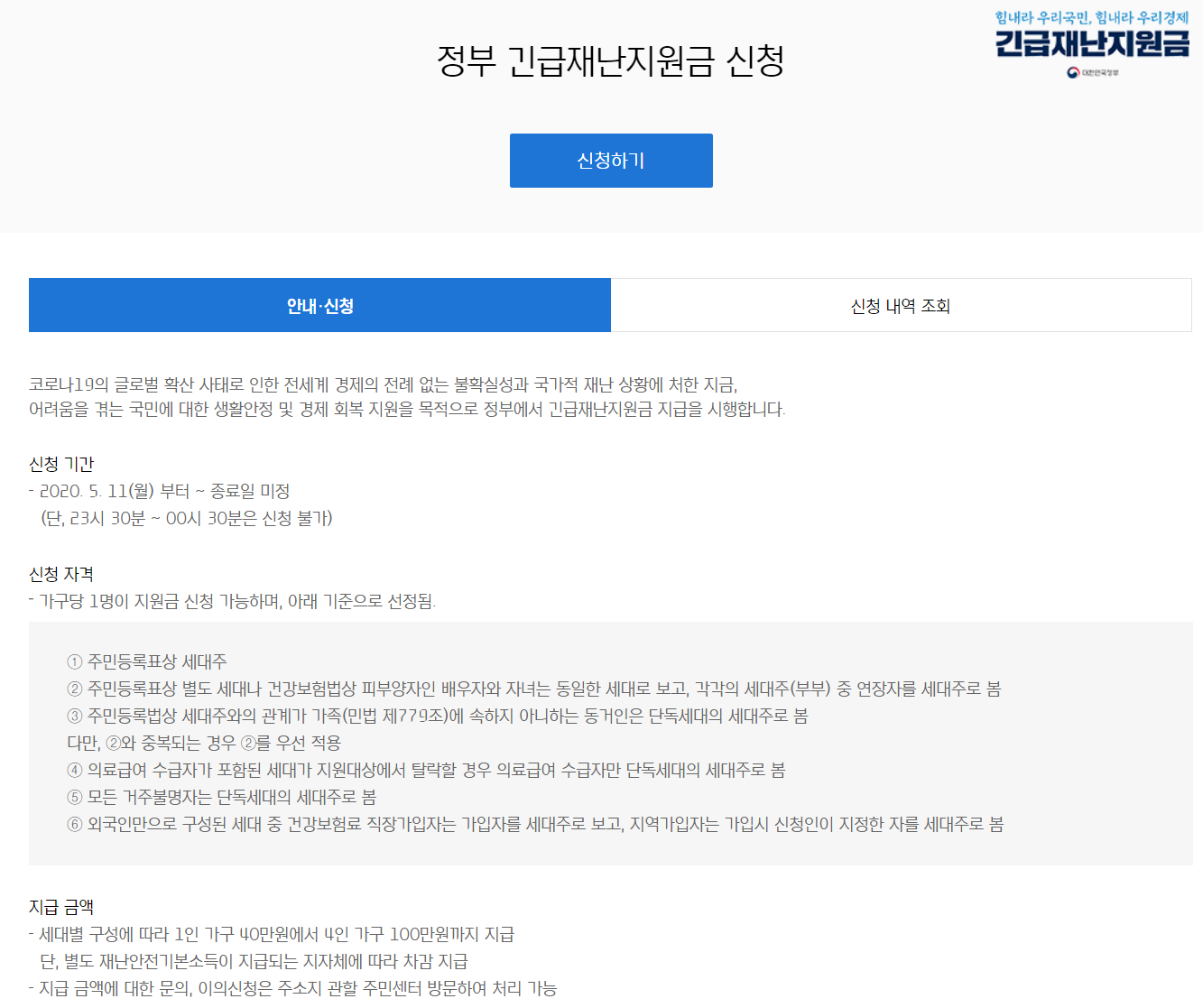 | 행정안전부 긴급재난지원금 안내 홈페이지 (1) | 2020.05.09 |
