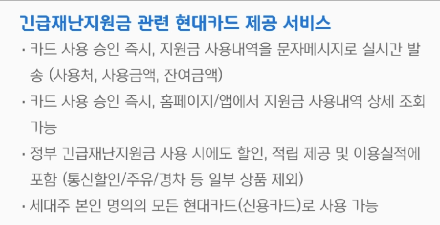 현대카드도 재난 지원금 사용내역 문자 실시간으로 바뀌었습니다.