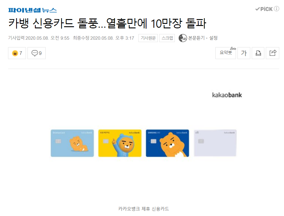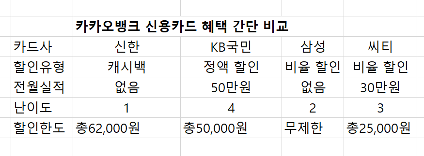 열흘만에 10만장을 돌파한 카카오뱅크 신용카드를 초간단 비교해봤습니다.