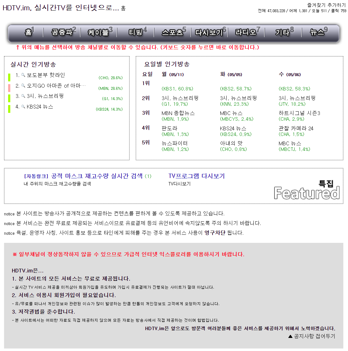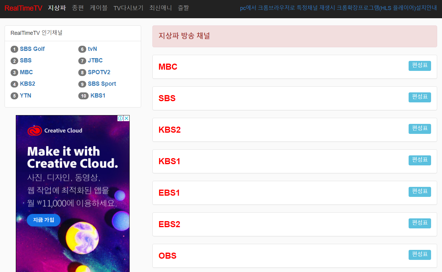 - 공중파 : MBC, SBS, KBS1, KBS2, EBS1, EBS2