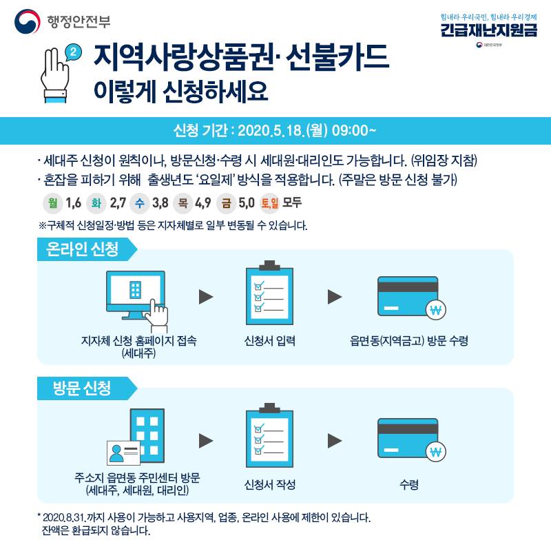 - 5.18.(월)부터 주소지 관할 읍면동 주민센터를 방문하여 긴급재난지원금을 신청하실 수 있습니다.